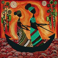 'Fishing African Girls' is een onberispelijk bewerkte expressie van het Afrikaanse landschap en de lokale bevolking die erin leeft. Dit werk, rijk gekleurd met acrylverf op paneel, is een gelegenheid om even stil te staan bij de eenvoudige maar essentiële handelingen van het dagelijks leven. Dit prachtige schilderij toont vissers - zowel mannen als vrouwen - die samenwerken om kleine visjes te vangen met netten, die hun dagelijkse maaltijd verschaffen in de Afrikaanse omgeving. De zwarte houten lijst vormt het perfecte contrast met de levendige kleuren van het schilderij zelf.
