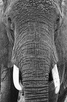 Deze indrukwekkende zwart-witfoto toont de olifant in al zijn majesteit en waardigheid. Frontaal in beeld gebracht, vult het dier het volledige kader — een ontmoeting die voelt als oog in oog staan met de oerkracht van de natuur. De ruwe textuur van de huid, de diepe groeven en de machtige slagtanden vertellen het verhaal van tijd, overleving en ervaring.