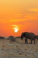 Een olifant staat voor de ondergaande zon in Etosha National Park.