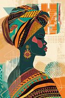 Deze abstracte afbeelding toont het profiel van een Afrikaanse vrouw in traditionele kleding, kunstig weergegeven in heldere kleuren en geometrische patronen. De opvallende vormen en het harmonieuze kleurenpalet benadrukken de culturele diversiteit en elegantie, terwijl de smaakvol gerangschikte accessoires haar gratie en waardigheid benadrukken. Deze moderne interpretatie van traditionele Afrikaanse esthetiek is een perfect kunstwerk voor liefhebbers van levendige, cultureel geïnspireerde kunst die een vleugje exotisme en creativiteit willen toevoegen aan hun ruimte.