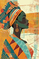 Deze abstracte afbeelding toont het profiel van een Afrikaanse vrouw in traditionele kleding, kunstig weergegeven in heldere kleuren en geometrische patronen. De opvallende vormen en het harmonieuze kleurenpalet benadrukken de culturele diversiteit en elegantie, terwijl de smaakvol gerangschikte accessoires haar gratie en waardigheid benadrukken. Deze moderne interpretatie van traditionele Afrikaanse esthetiek is een perfect kunstwerk voor liefhebbers van levendige, cultureel geïnspireerde kunst die een vleugje exotisme en creativiteit willen toevoegen aan hun ruimte.