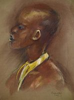 Trotse Afrikaanse schoonheid met een gouden halssieraad. Trots op hun afkomst. Pastel tekening op gekleurd papier.
