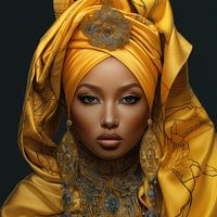 Prachtige vrouw met hoofddoek. Gouden sieraden bedekken haar. Het ijkt op een Afrikaanse Queen en heeft ook een beetje Egyptisch in zich.