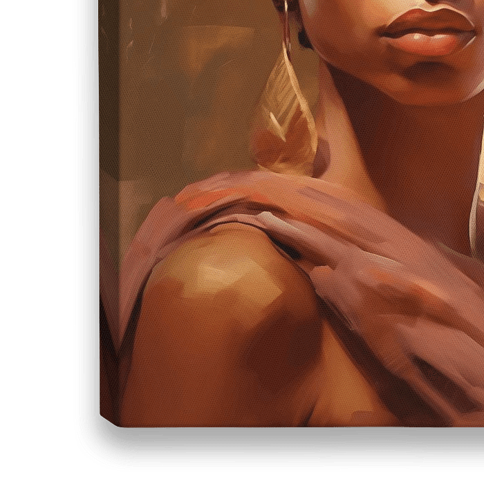 Dit portret toont een Afrikaanse vrouw met een hoofddoek in warme tinten van roze en oranje, die haar gelaatstrekken zacht omlijsten. De achtergrond in goud en beige tinten versterkt haar silhouet en zorgt voor een rijke, warme sfeer. De blik van de vrouw is introspectief en haar houding waardig, wat bijdraagt aan de algehele serene…