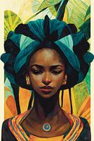 Kleurrijk exotisch werk. Ik heb de achtergrond diverse keren gewijzigd voordat ik het vond passen bij de mooie Afrikaanse vrouw op de voorgrond. Of een Afrikaanse dame haar haarband ooit zo gedragen heeft, betwijfel ik. Maar ik vond het er zo heel decoratief uitzien.