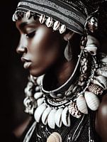 Afrikaanse vrouw met etnische sieraden, gemaakt van schelpen. Een bijzondere blikvanger voor je interieur! Kies zelf het formaat en materiaal bij dit werk en maak het helemaal naar wens.