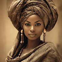 Portret van een prachtige Afrikaanse vrouw met hoofddoek die doorgaat in een sjaal. Kleurstelling zwartgoud sepia. Mooie oorbellen complementeren het geheel. Passend bij diverse stijlen en trends. Artist: Bianca ter Riet.