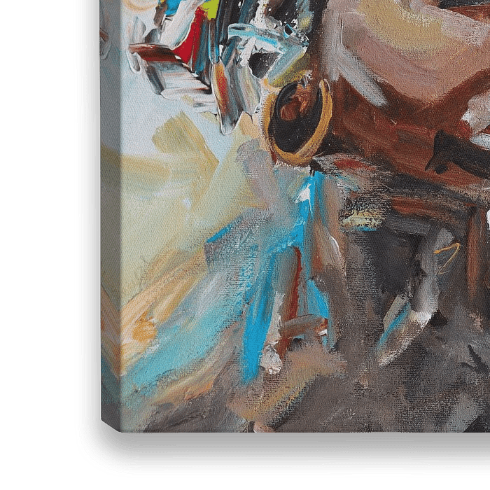 Portretschilderij van Afrikaanse vrouw met kleurig hoofddoek in acrylverf .