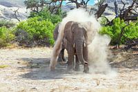 Afrikaanse woestijnolifant douchend met zand in Namibië