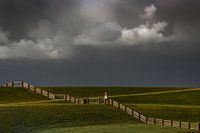 De dijk nabij de Friese plaats Westhoek en een donkere lucht boven het Waddengebied met de avondzon op het hek.