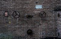 Roestige afsluiters op een bakstenen muur, in een verlaten fabriek in Nederland.