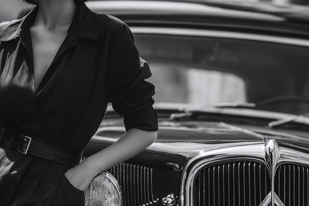 De foto straalt Franse charme en levensstijl uit - een geslaagde combinatie van mode, autocultuur en de flair van vervlogen tijden.