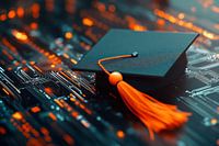 Een symbool van kennis en succes dat perfect past in een modern kantoor. De fel oranje accenten van de afstudeerhoed zijn opvallend en combineren traditie met futuristische technologie. Deze afbeelding inspireert en herinnert ons eraan dat leren de sleutel is tot nieuwe kansen en creëert een motiverende sfeer.