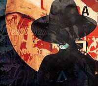 Abstracte kunst,Collage in voornamelijk zwart,oranje en rood tinten op papier met een portret van een vrouw met hoed