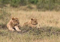 Het is goed rusten na een uitgebreid diner! Twee jonge leeuwen bovenop een kleine heuvel nadat ze zich tegoed hadden gedaan aan een zebra!