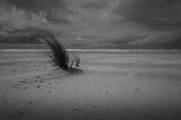 Je bekijkt een sfeervolle en dramatische strandfoto, waarin de kracht van de natuur centraal staat. Op de voorgrond groeit een pol helmgras, stevig geworteld in het zand, gebogen onder invloed van een harde wind. De achtergrond toont een breed, verlaten Noordzeestrand dat zich uitstrekt tot aan de ruige, schuimende branding van de zee.…