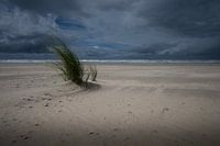 Je bekijkt een sfeervolle en dramatische strandfoto, waarin de kracht van de natuur centraal staat. Op de voorgrond groeit een pol helmgras, stevig geworteld in het zand, gebogen onder invloed van een harde wind. De achtergrond toont een breed, verlaten Noordzeestrand dat zich uitstrekt tot aan de ruige, schuimende branding van de zee.…