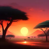 Het kunstwerk "Afterglow" betovert de toeschouwer met een betoverend tafereel dat de magische overgang van dag naar nacht in een Afrikaans landschap vastlegt. In het centrum van het beeld staat een majestueuze, ondergaande zon, haar warme stralen de lucht doordrenkend met tinten van oranje, roze en goud. Deze warme tonen dompelen het…