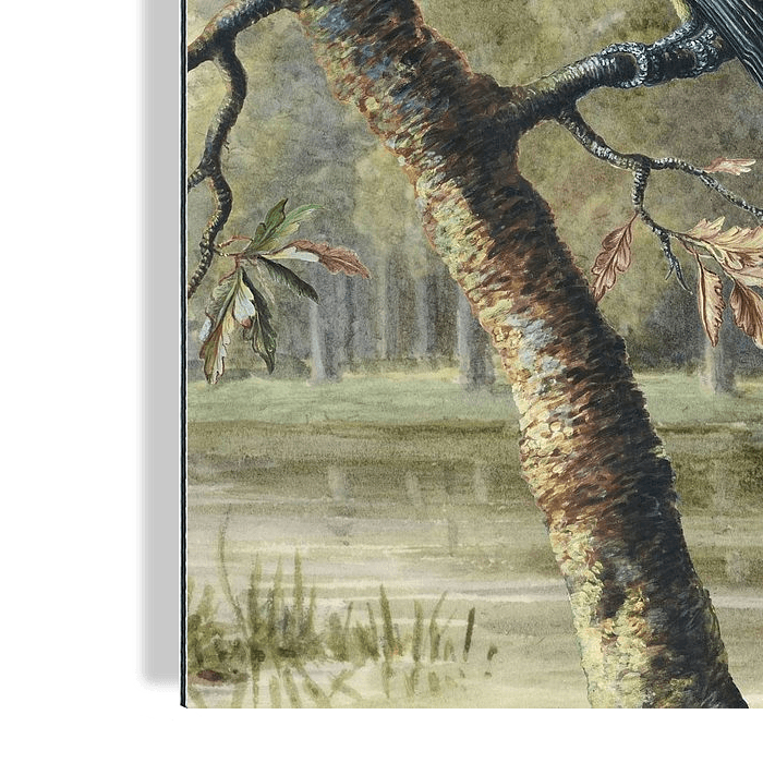Het is een collage van een landschap, geschilderd door Georgius Jacobus Johannes Van Os en een prent van een vogel op een tak, gemaakt door George Edwards.