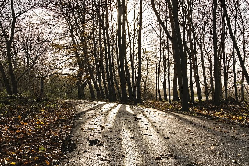 De zon scheen mooi door de bomen over de gevallen bladeren en de weg een warme zachte herfstsfeer met de Maas op de achtergrond.