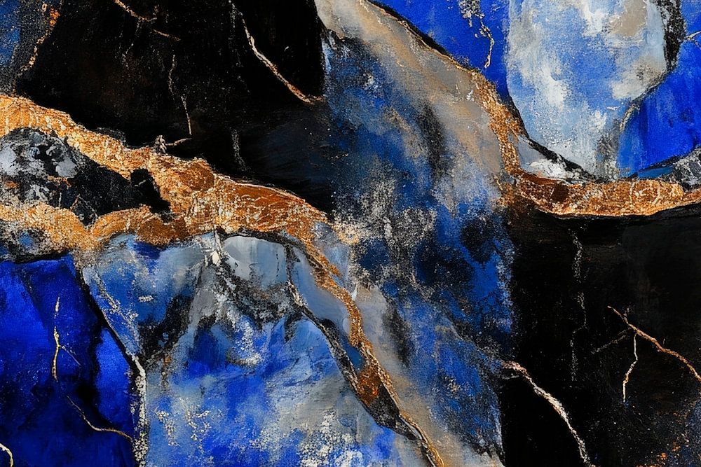 Een fascinerende compositie van kostbare geologische patronen ontvouwt zich in intense blauw- en goudtinten, die doen denken aan de mystieke diepten van de zee. De gebogen lijnen en het contrast tussen licht en donker voegen een vleugje elegantie toe. Perfect voor de woonkamer om een gevoel van rust en luxe te creëren.