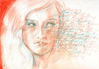 Portret van een vrouw met een afwachtende blik, wat gaat er gebeuren... hoe ziet de toekomst eruit. Ze heeft vertrouwen en besluit te leven in het nu. Het woord 'Afwachting' is repeterend door haar heen geschreven.