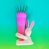 Fresh, colorful and happy arty picture with rabbit and dishes cleaner in the form of a carrot . Very original art in your house but also nice as wallpaper or poster .