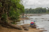 Vrouwen doen de afwas bij Danpaati in de rivier in Suriname