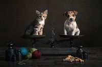 Een ouderwetse weegschaal met daarop een jack Russel pup en een kitten. Een stilleven met de afweging wat je voor huisdier je kan of wilt hebben.