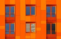 Afwijkende weerspiegeling in een raam van een oranje kantoor en appartementencomplex in Groningen.