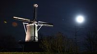Houtzaagmolen Agneta onder een bijna volle maan. Het zijn de donkere dagen voor kerst, vandaar de ster in top.