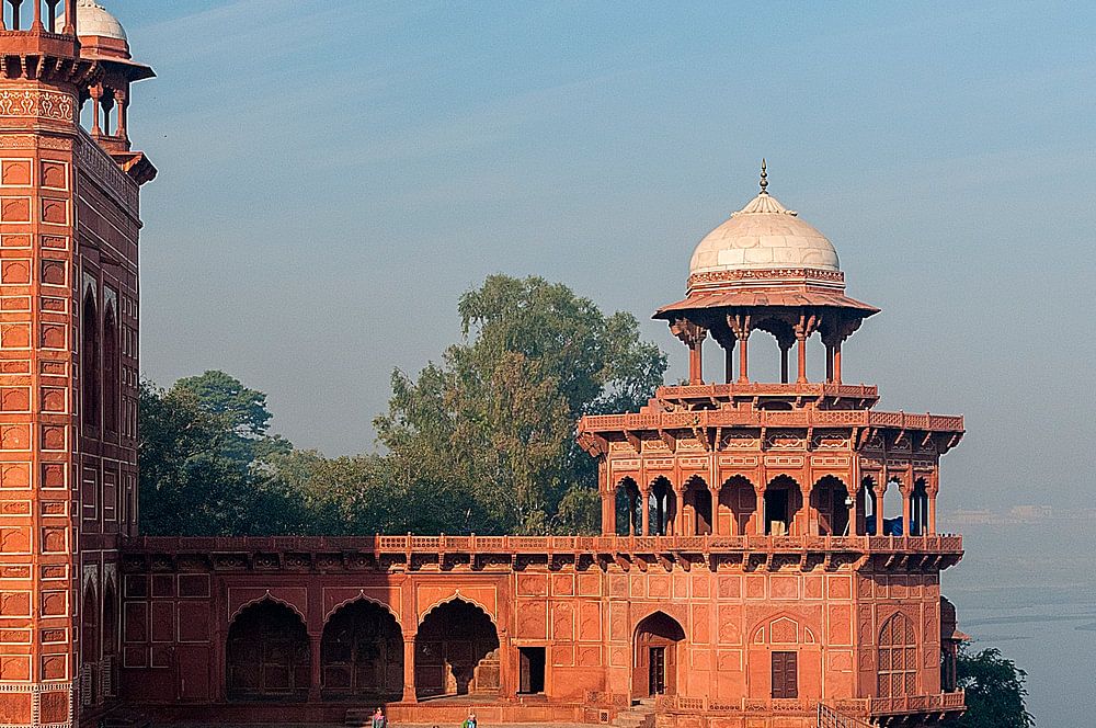 De Taj Mahal is een imposant, wit marmeren mausoleum in Agra (Uttar Pradesh). Shah Jahan, de vijfde heerser van het Mogolrijk, liet het grafmonument tussen 1632 en 1648 bouwen als laatste rustplaats voor zijn geliefde echtgenote Mumtaz Mahal, die in 1631 in het kraambed was overleden. Na de dood van Shah Jahan werden ook diens resten bijgezet in de tombe.De Mogoldynastie had de gewoonte om voor haar leden grafmonumenten in symmetrisch aangelegde tuinen te bouwen. Tuinen staan in de islamitische traditie symbool voor het paradijs en de Mogols poogden voor hun overledenen een hemelse woonplaats op aarde te scheppen. De grootschaligheid en esthetische verfijning van deze bouwwerken diende tevens de luister van hun heerschappij te onderstrepen. Een eerste hoogtepunt in deze traditie was Humayuns tombe in Delhi, in de jaren 1560 gebouwd door Akbar.De Taj Mahal staat niet zoals gebruikelijk in het midden van de tuin, maar op een verhoogd platform aan de oever van de Yamuna-rivier in Agra en domineert zo de wijde omgeving. Vier vrijstaande minaretten bezetten de hoeken van het platform en geven het bouwwerk een driedimensionale referentie. De Taj Mahal wordt geflankeerd door twee identieke - in contrasterend rood zandsteen opgetrokken - gebouwen, de moskee en het gastenverblijf. Tussen het mausoleum en de hoofdpoort van het complex ligt de tuin, die door kanalen in vier gelijke perken verdeeld is volgens het Perzische chahar bagh-patroon.Het mausoleum wordt geroemd om de volmaakt ui