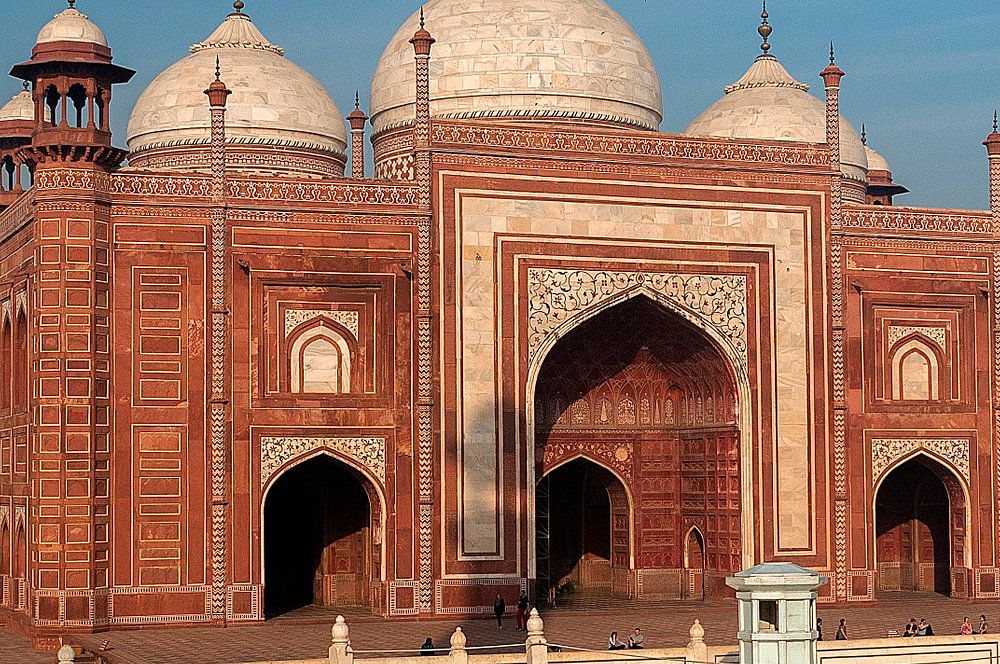 De Taj Mahal is een imposant, wit marmeren mausoleum in Agra (Uttar Pradesh). Shah Jahan, de vijfde heerser van het Mogolrijk, liet het grafmonument tussen 1632 en 1648 bouwen als laatste rustplaats voor zijn geliefde echtgenote Mumtaz Mahal, die in 1631 in het kraambed was overleden. Na de dood van Shah Jahan werden ook diens resten bijgezet in de tombe.De Mogoldynastie had de gewoonte om voor haar leden grafmonumenten in symmetrisch aangelegde tuinen te bouwen. Tuinen staan in de islamitische traditie symbool voor het paradijs en de Mogols poogden voor hun overledenen een hemelse woonplaats op aarde te scheppen. De grootschaligheid en esthetische verfijning van deze bouwwerken diende tevens de luister van hun heerschappij te onderstrepen. Een eerste hoogtepunt in deze traditie was Humayuns tombe in Delhi, in de jaren 1560 gebouwd door Akbar.De Taj Mahal staat niet zoals gebruikelijk in het midden van de tuin, maar op een verhoogd platform aan de oever van de Yamuna-rivier in Agra en domineert zo de wijde omgeving. Vier vrijstaande minaretten bezetten de hoeken van het platform en geven het bouwwerk een driedimensionale referentie. De Taj Mahal wordt geflankeerd door twee identieke - in contrasterend rood zandsteen opgetrokken - gebouwen, de moskee en het gastenverblijf. Tussen het mausoleum en de hoofdpoort van het complex ligt de tuin, die door kanalen in vier gelijke perken verdeeld is volgens het Perzische chahar bagh-patroon.Het mausoleum wordt geroemd om de volmaakt ui