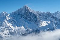 De besneeuwde top van de Aiguille Verte. Deze berg ligt in de Mont Blanc keten boven Chamonix in de franse Alpen.