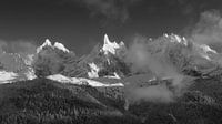 Verse sneeuw en wolken zetten de Aiguilles de Chamonix in een sfeervolle setting. Deze bergen van rots liggen in de Mont Blanc vallei van de Franse Alpen. Zwart-wit foto.
