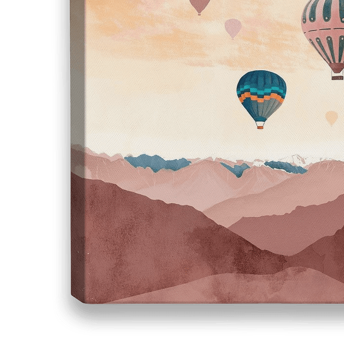Een illustratie om in te verdwalen! Een bergachtig landschap afgetekend tegen een lucht in de kleuren van een ondergaande zon. Vele luchtballonnen in prachtige kleuren zweven door het beeld. Laat het avontuur beginnen!
