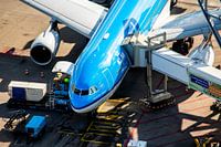 luchtfoto van een Airbus A330 van KLM die aan de gate wordt voorbereidt om weer te vertrekken vanaf Schiphol.