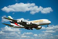 De Airbus A380-842, van Emirates met registratie A6-EVD. Hier in de landing. Het toestel is gebouwd in 2018 en vliegt nog actief. Veel A380's zijn stil gezet ivm de coronacrisis (te weinig aanbod van passagiers). Het toestel is uitgerust met 4 Rolls Royce motoren en vliegt meestal China-Dubai-Europa routes.