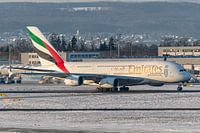 Een Airbus A380 van Emirates is begonnen aan de take-off vanaf de luchthaven van Frankfurt.
