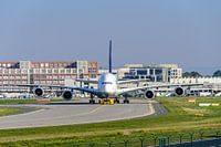 Een Airbus A380 van Lufthansa wordt gesleept naar een hangar.