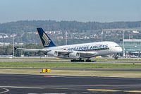Een Airbus A380 van Singapore Airlines (9V-SKS) stijgt op van de luchthaven van Zürich op een mooie zonnige herfstdag in oktober 2017.
