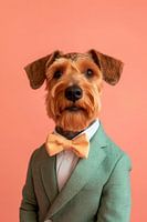 Deze Airedale Terrier zit stijlvol en charmant in een elegant pak, zijn vachtkleur glanst in harmonieus bruin en zwart. De statige oren en expressieve blik geven hem een onmiskenbare persoonlijkheid. Met een delicaat strikje en een zelfverzekerde houding lijkt hij klaar voor een feestelijke gelegenheid - het toppunt van canine dandy!