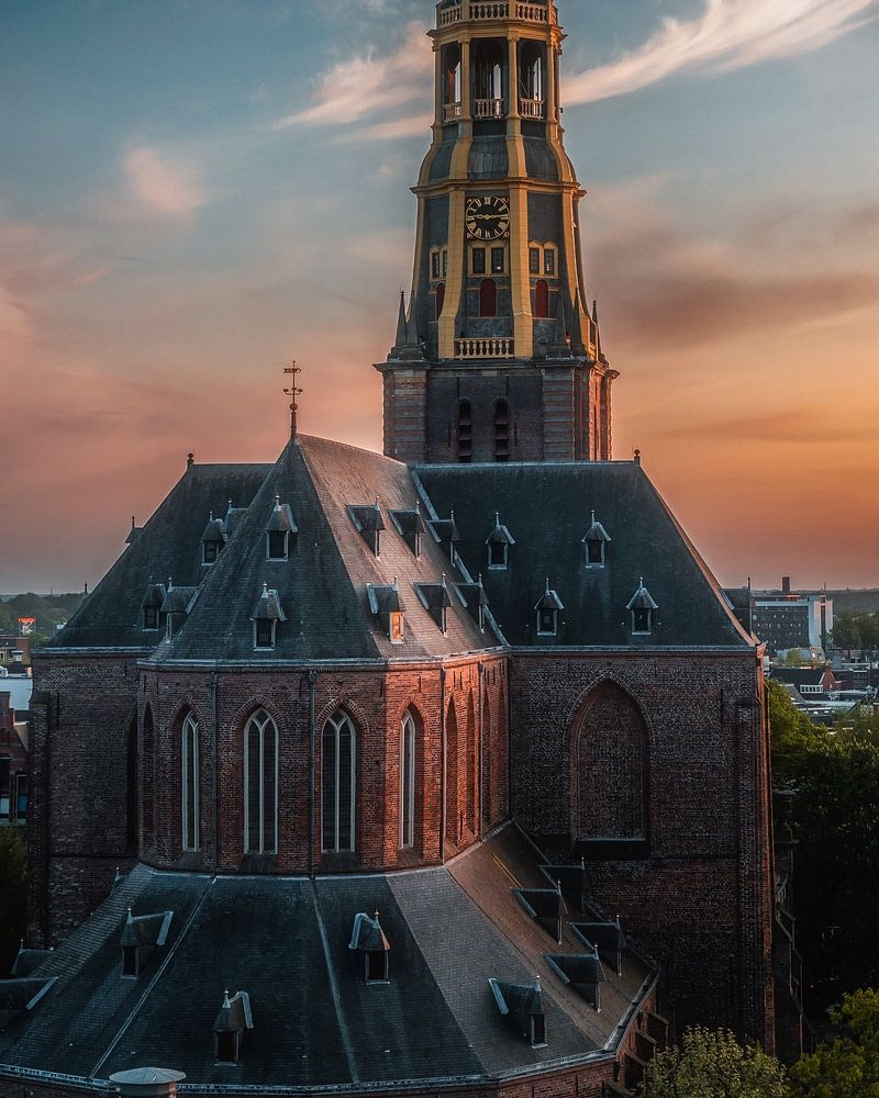 Het laatste licht van de dag valt zacht op de zijkant van de Akerk in Groningen stad, vlak voor de zonsondergang. De skyline van Groningen wordt verfraaid door de prachtige kleuren van de ondergaande zon.