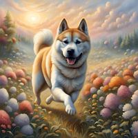 Koop dit digital art kunstwerk Akita spelend in een bloemenveld van Johannas Art Creations als reproductie op canvas, aluminium dibond, (ingelijste) fotoprint, behang en ArtFrame, op maat geprint in Fine-Art kwaliteit.