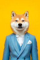 Een majestueuze Akita met een charmant, goed gebruikt gezichtsveld staat in een elegant blauw pak. Zijn alerte ogen schitteren van intelligentie, terwijl de zachte, strakke lijnen van zijn vacht glinsteren in warme aardetinten. De felgele achtergrond versterkt zijn aanwezigheid en voegt een levendige, vrolijke noot toe aan de scène.
