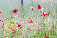 Een mistige ochtend bracht me bij een weiland in de Betuwe waar veel bloemen stonden te bloeien. Een leuk en kleurig beeld waar je vrolijk van wordt.