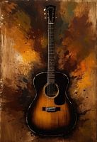 Een akoestische gitaar staat centraal in dit schilderachtige clair-obscur werk, waarvan het silhouet opvallend helder wordt onthuld tegen lagen van diepe schaduw. De gitaar wordt omgeven door spatten, als trillingen die voortkomen uit elke resonerende noot. De getextureerde penseelstreken geven de scène energie en emotie, waardoor het instrument zowel een symbool van kunstenaarschap als een levende aanwezigheid op het doek wordt. Een werk voor liefhebbers van de kracht van muziek en de visuele poëzie van geluid gevangen in beweging.