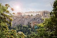 Uitzicht op de Akropolis in Athene, Griekenland. Mooi omlijst door de groene omgeving.