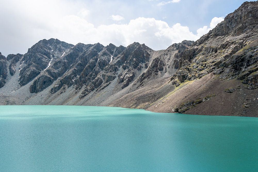 het Ala Kul bergmeermet felblauw water in de bergen in de buurt van Karakol in oostelijk Kirgizië op een halfbewolkte dag
