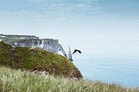 Kraai tijdens de vlucht met uitzicht op de rotspoort Falaise d'Etretat, Normandië, Frankrijk